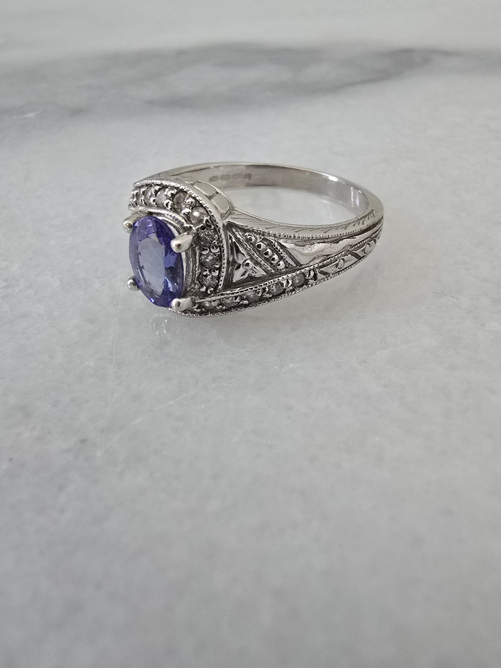 Elegant 14k white gold ring featuring a stunning oval-cut tanzanite as the centerpiece, beautifully framed by sparkling round diamond accents. This sophisticated piece showcases partial British hallmarks, confirming its precious metal authenticity. Sized at 8.25 and weighing 4.8 grams, it offers a refined balance of presence and wearability. The cool white gold complements the deep blue-violet tones of the tanzanite, creating a timeless look perfect for special occasions or everyday luxury. A distinctive choice for those seeking a gemstone alternative with exceptional color and brilliance.