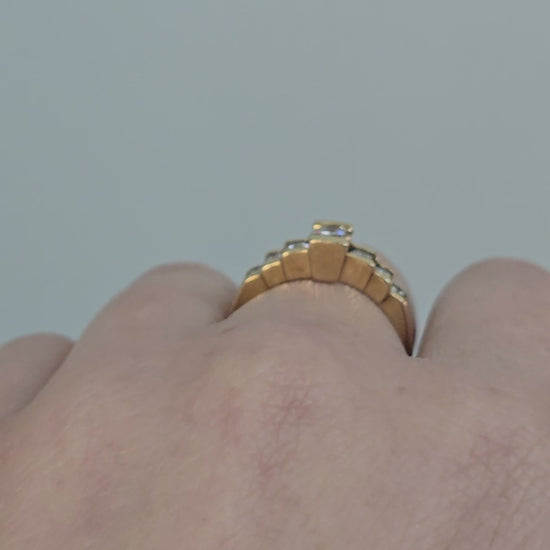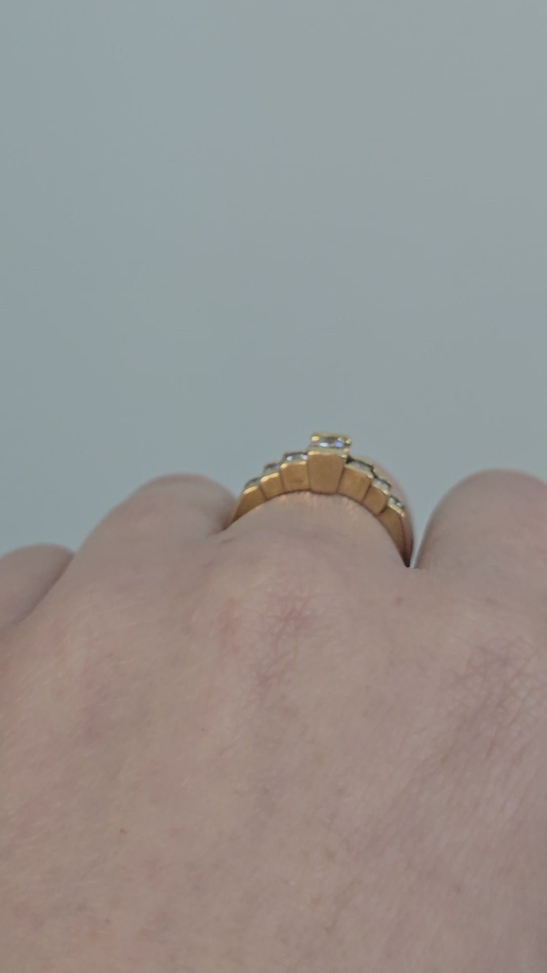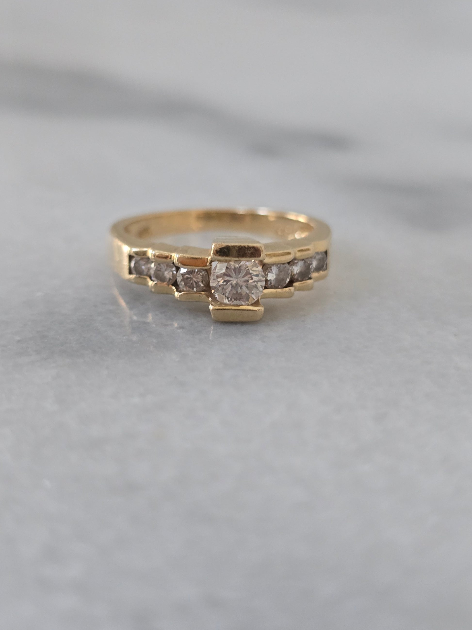 Crafted in 14K gold, this ring features 0.67 carat round brilliant diamonds. The center stone is 4.43mm with K-L color and SI2-I1 clarity, while the adjacent stones measure 2.00-2.80mm in SI1-SI2 clarity. Stamped 14k and weighs 4 grams.