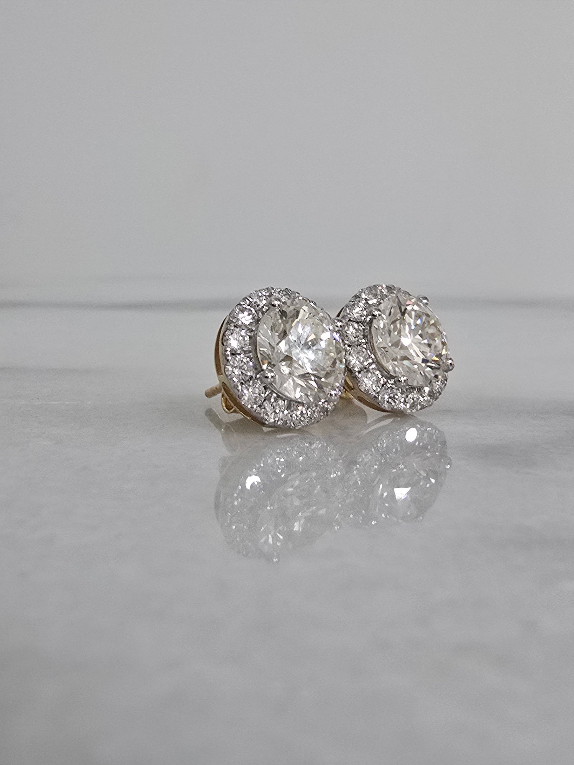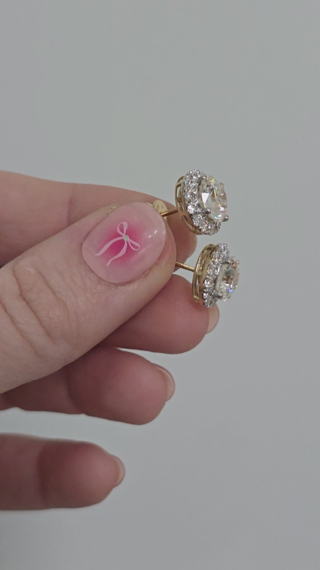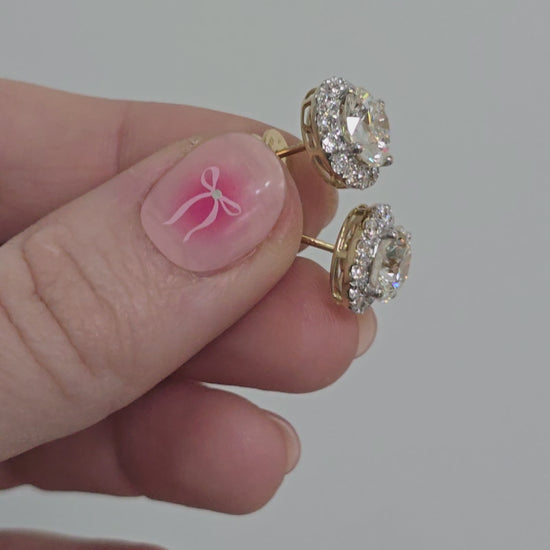 The center lab diamonds are approximately 2ct each (J/K color, VS1/VS2 clarity). They are inscribed with the Lightbox logo. The surrounding lab diamonds equal approximately 0.5ct per stud, in H-J color and SI1 clarity.