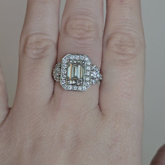 This striking statement ring features 4.01 total carats of laboratory-grown diamonds, set in 14kt gold. At the center is a beautifully proportioned 2.51 carat emerald-cut lab-grown diamond, graded G color, SI1 clarity. The center stone is IGI certified.