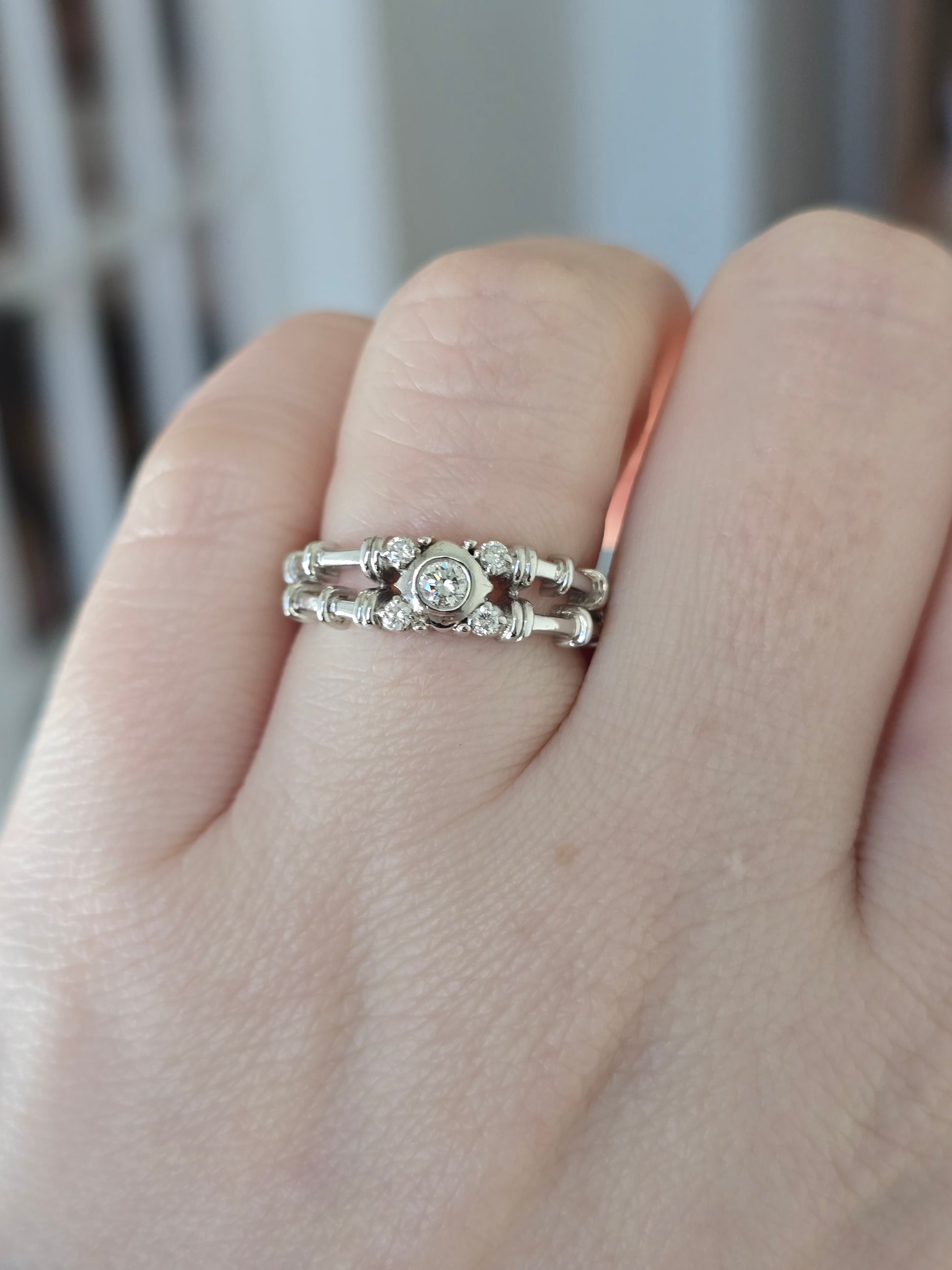 Exquisite vintage diamond dress ring crafted in 18k white gold, featuring a distinctive bifurcated band inspired by delicate bamboo shoots. Adorned with sparkling round brilliant cut diamonds, this elegant piece showcases authentic British hallmarks and timeless design. Size L (5.75) with a weight of 4.8 grams, it's a sophisticated statement for the discerning collector or as a treasured heirloom piece.