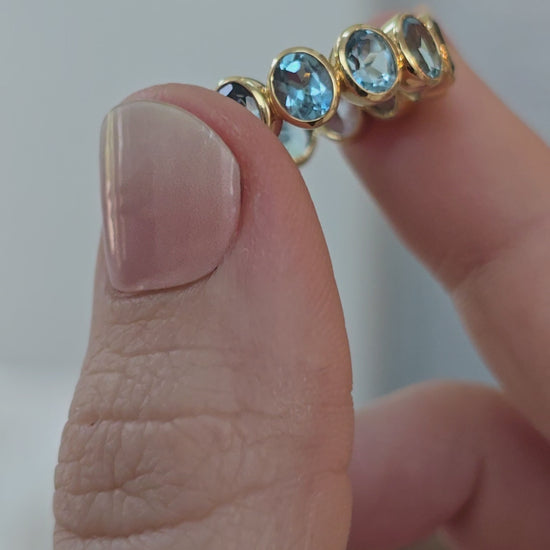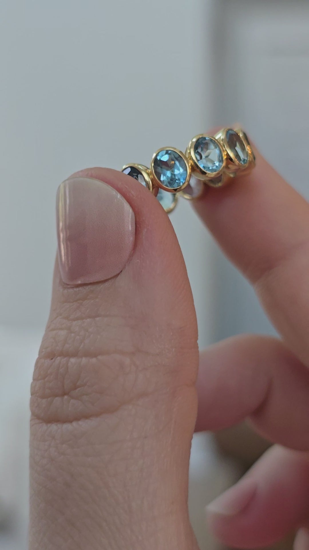 Crafted in 18K yellow gold, this elegant eternity band showcases a stunning oval-faceted blue topaz at its center. The stone measures 5.50 × 4.50 mm, displaying brilliant faceting that catches the light beautifully. Hallmarked 750 for authenticity, this ring weighs 4.60 grams and is sized at 6.75. A timeless piece that combines luxury materials with refined design, perfect for those who appreciate understated sophistication and fine jewelry craftsmanship.
