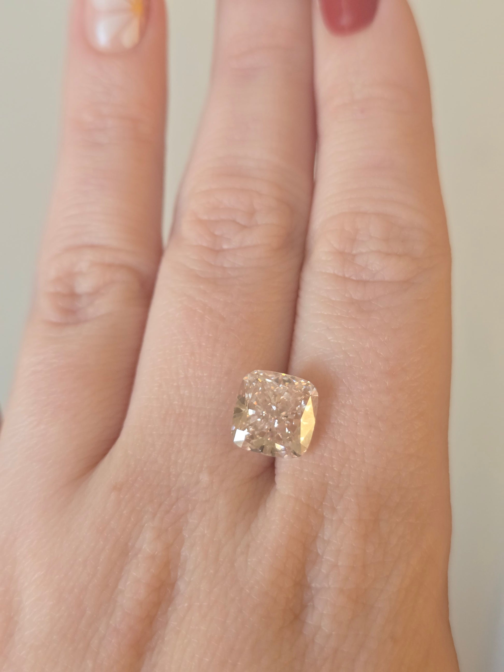 This 5.09-carat cushion-cut lab grown diamond features a striking Fancy Pink color with exceptional clarity ranging from VS1 to VS2. Measuring 9.41 × 9.25 × 6.39 mm, its elegant shape and vivid hue create a sophisticated gem that combines ethical craftsmanship with exquisite beauty.