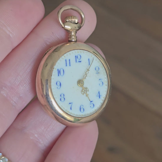 A charming antique Elfin pocket watch crafted in solid 14K gold, featuring a petite case and classic early 20th-century design. The watch has a warm gold tone and elegant proportions, making it a beautiful collectible piece or a unique addition to a watch chain or pendant conversion.