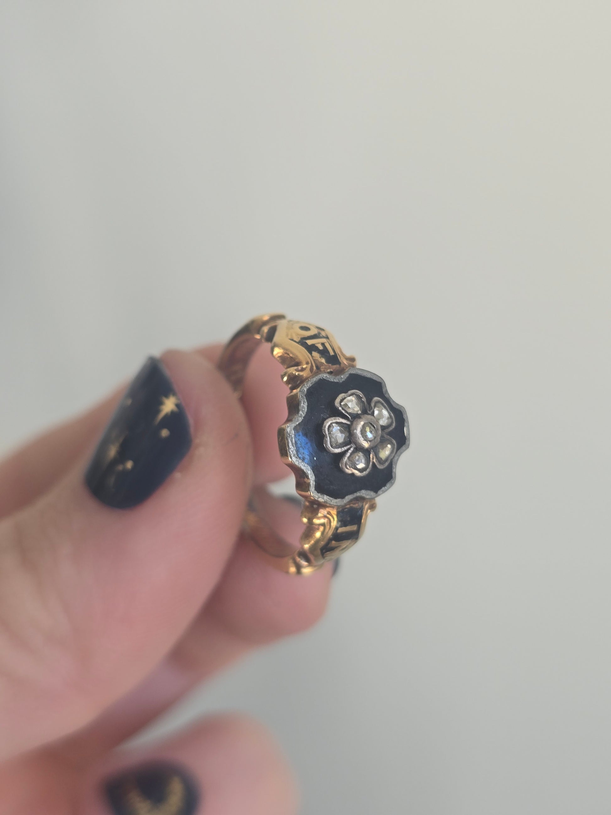 This Antique Diamond and Enamel Mourning Ring is 18ct yellow gold and silver, comprising a floral motif set with rose cut diamonds over a ground of black