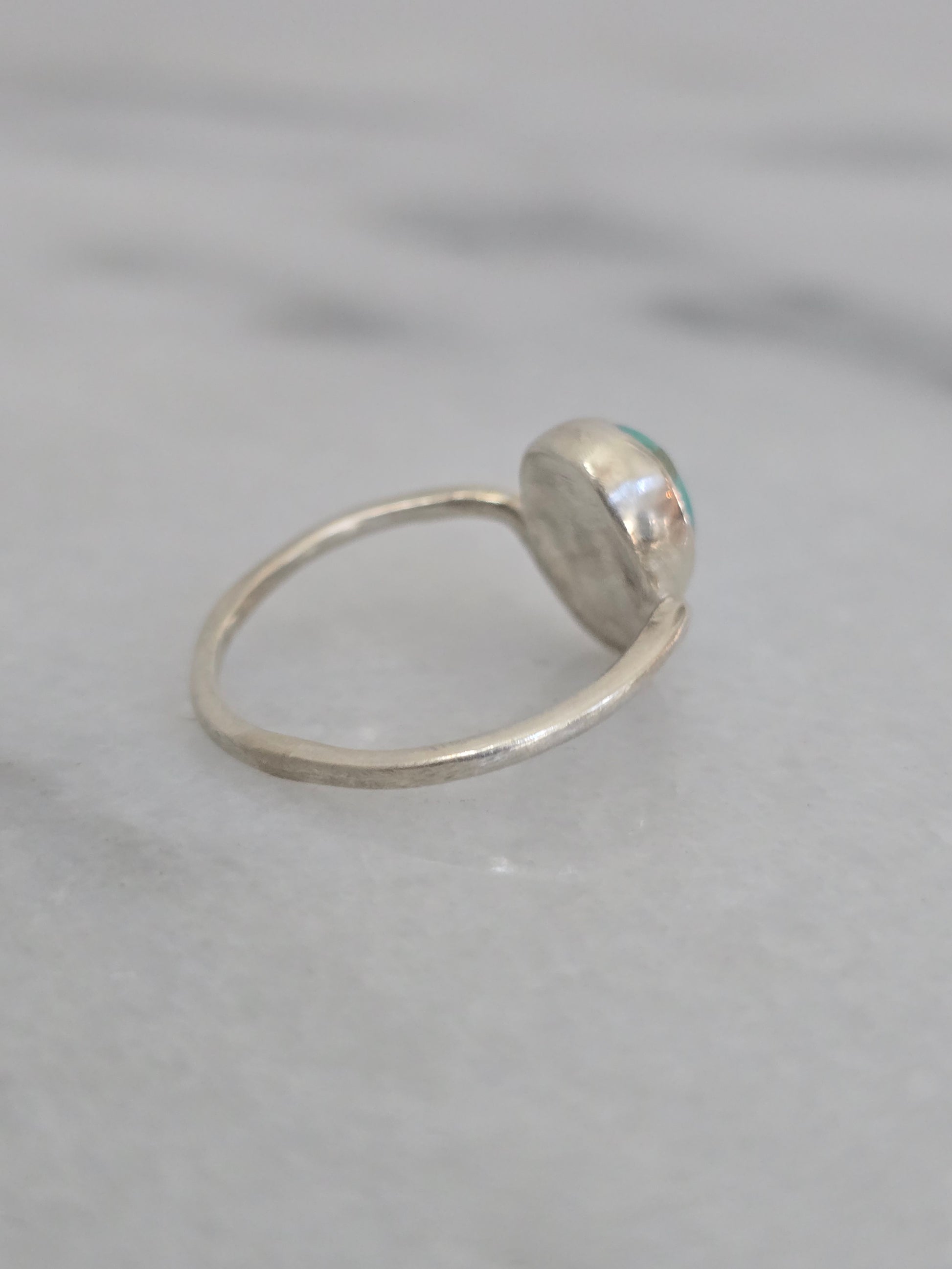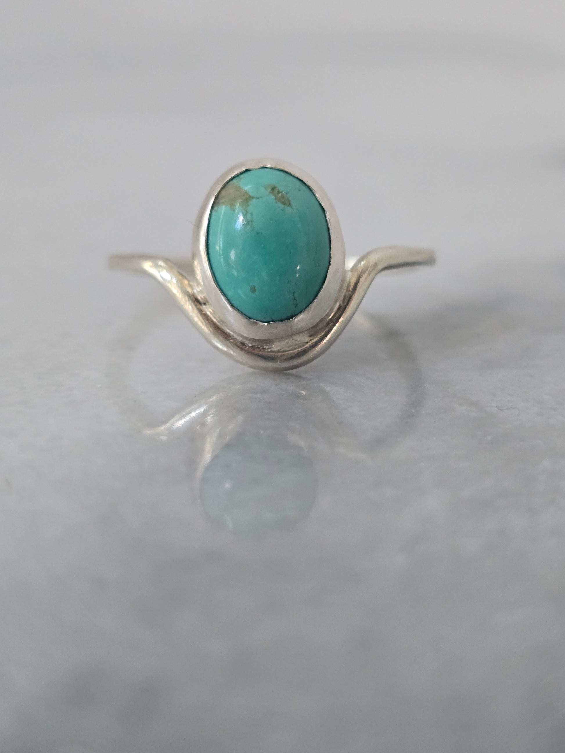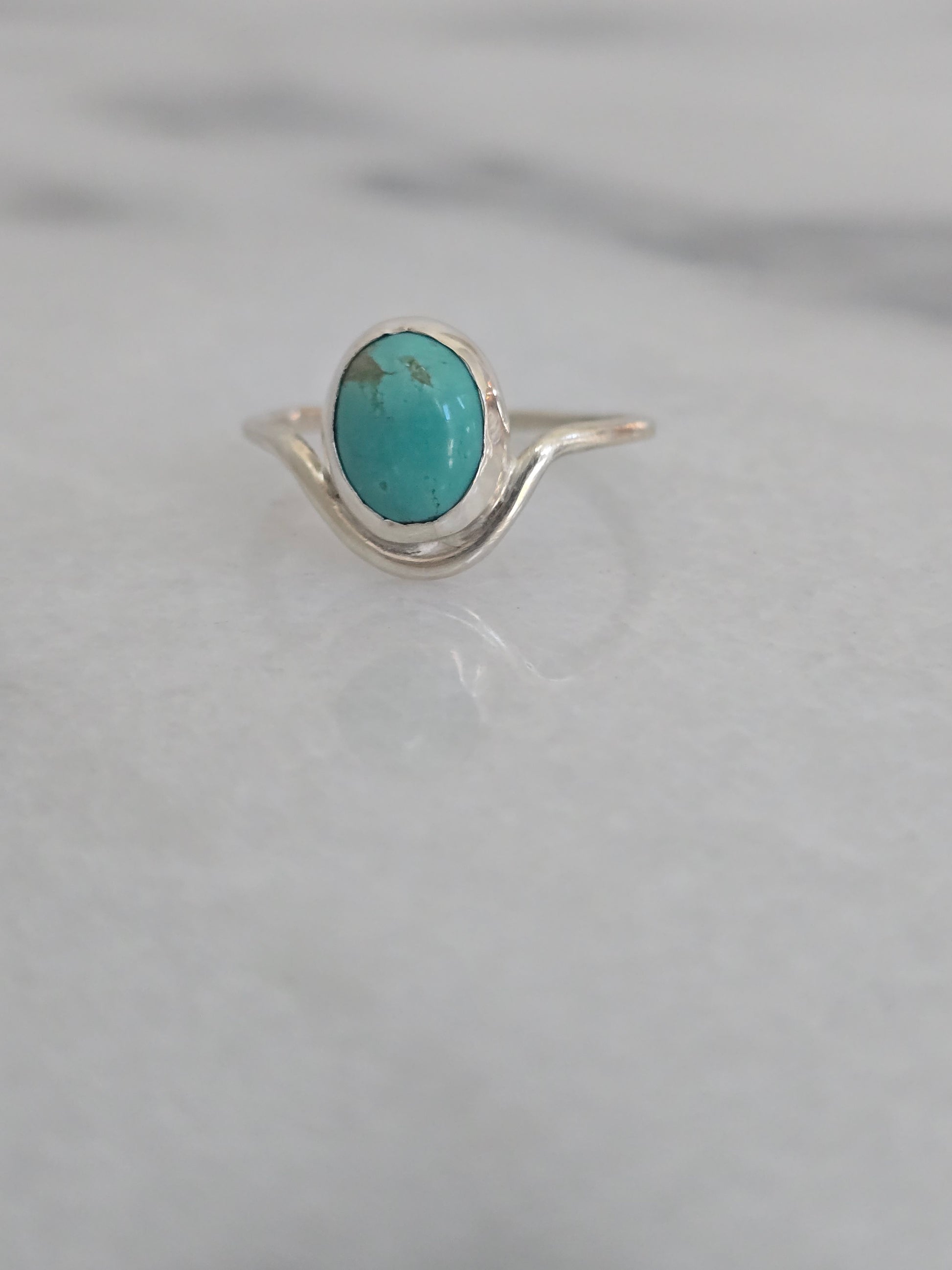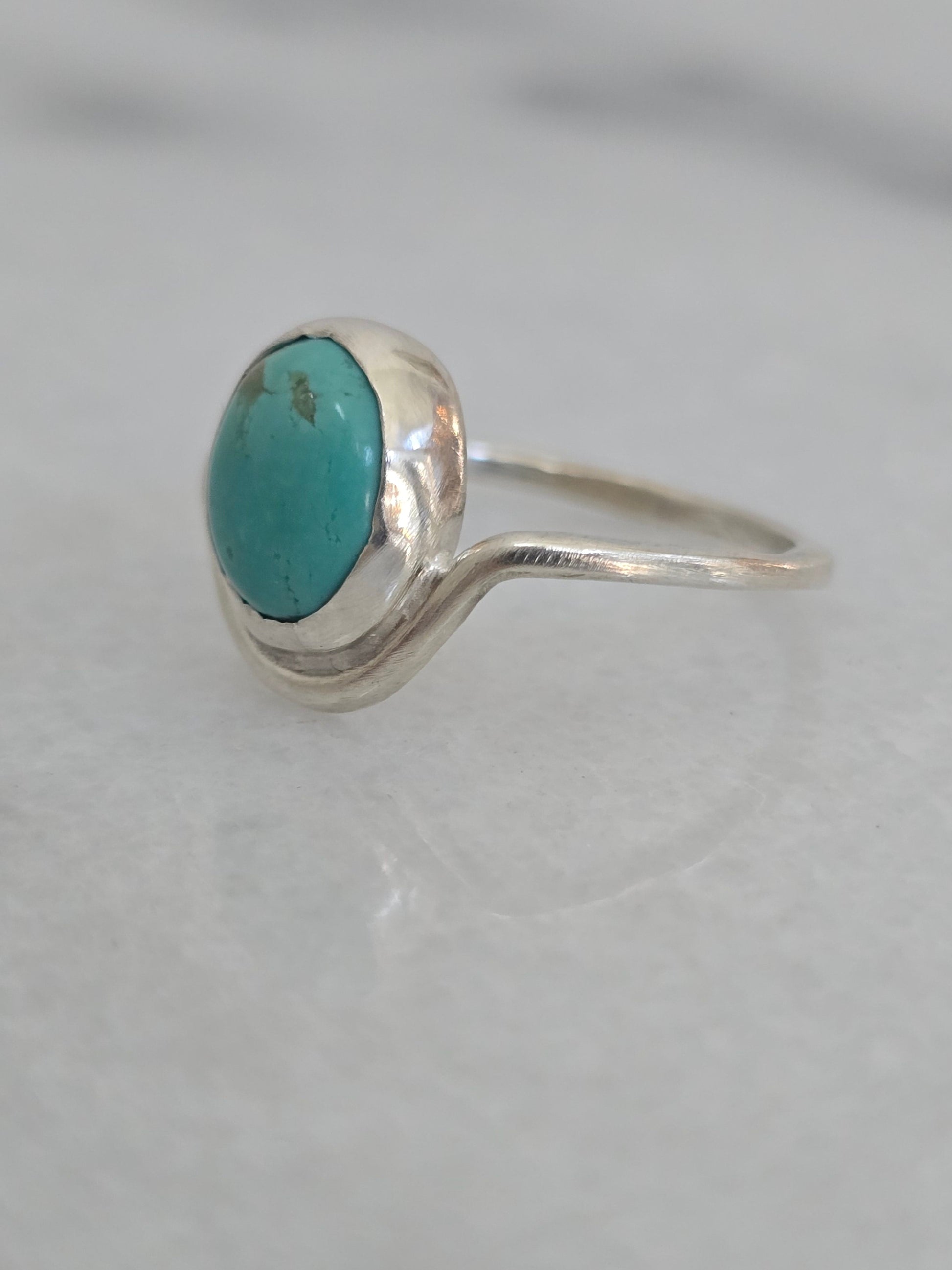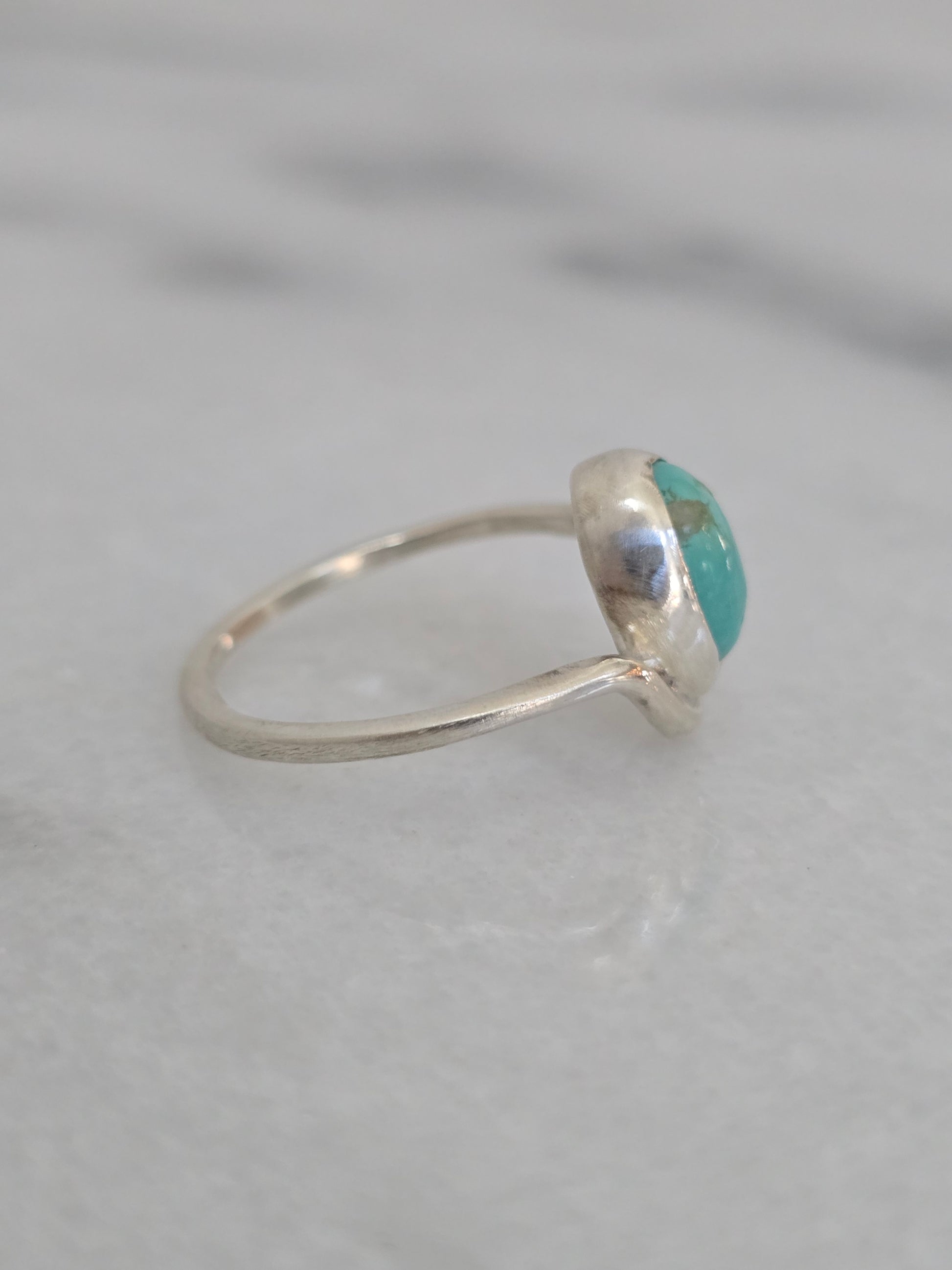 Part of the Terra Collection, the Cove Ring features a vibrant Bisbee Turquoise cabochon set in a smooth sterling silver bezel on a gently curved band. The stone’s rich blue-green hues and natural matrix evoke the hidden beauty of a coastal cove, making each ring uniquely captivating.