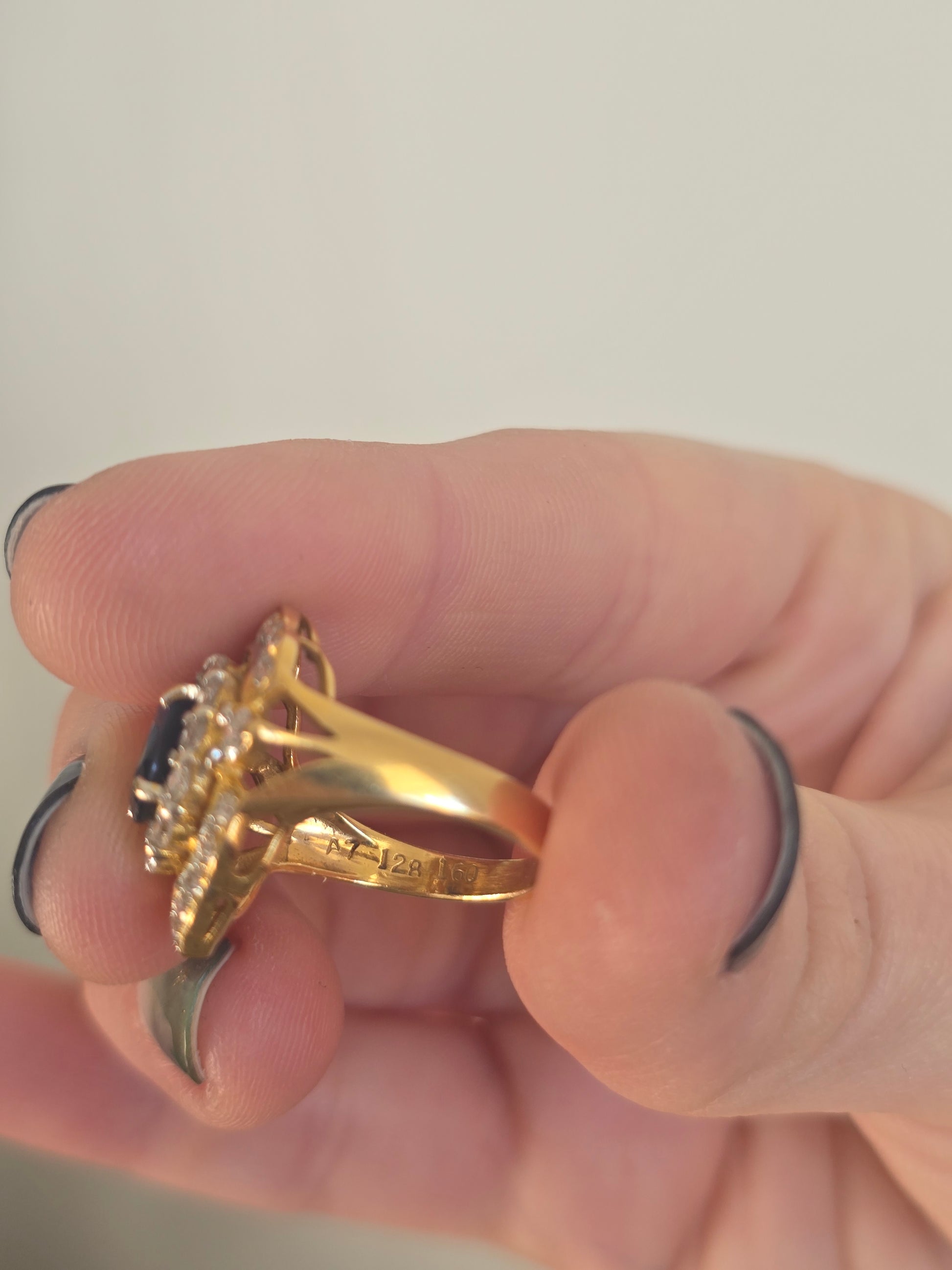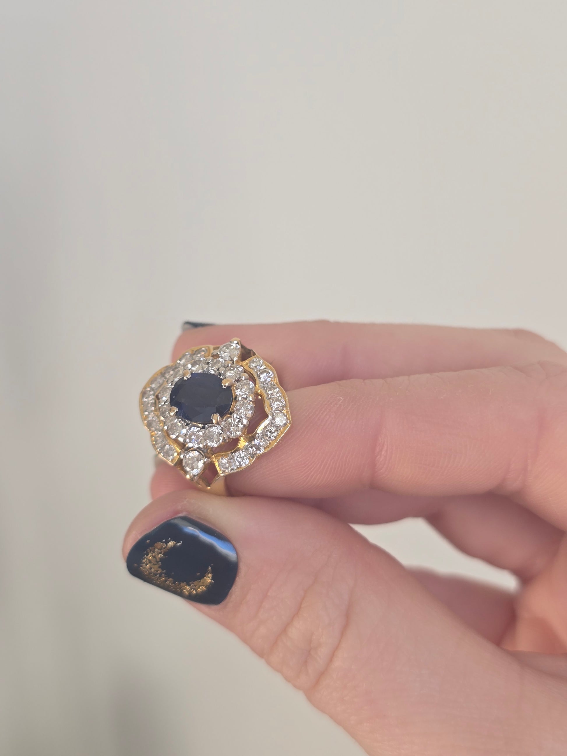 This sapphire and diamond ring is set with an oval cut sapphire of 1.28 carats, within a border of round brilliant cut diamonds totaling 1.60 carats. The ring is 6.6 grams.