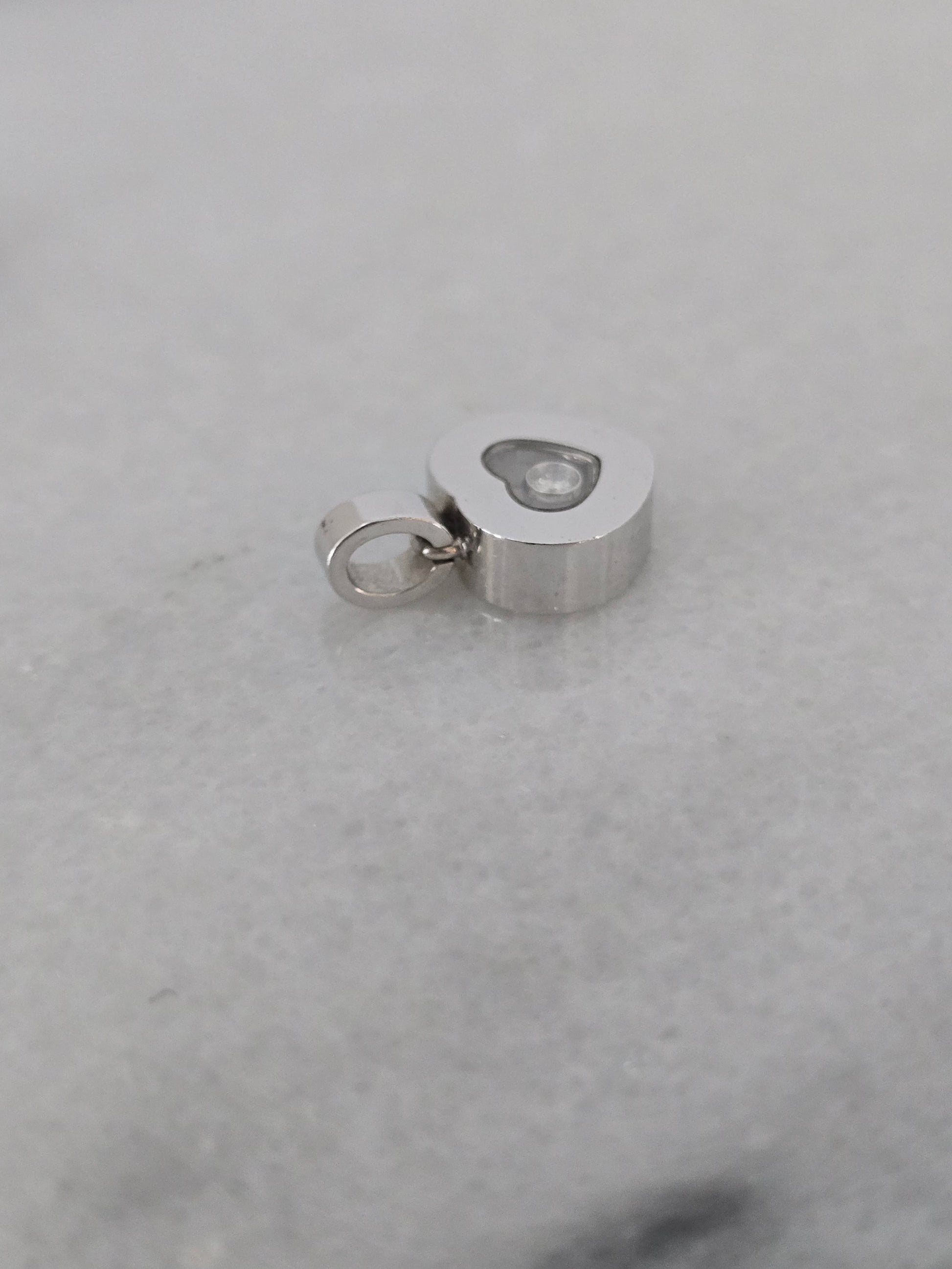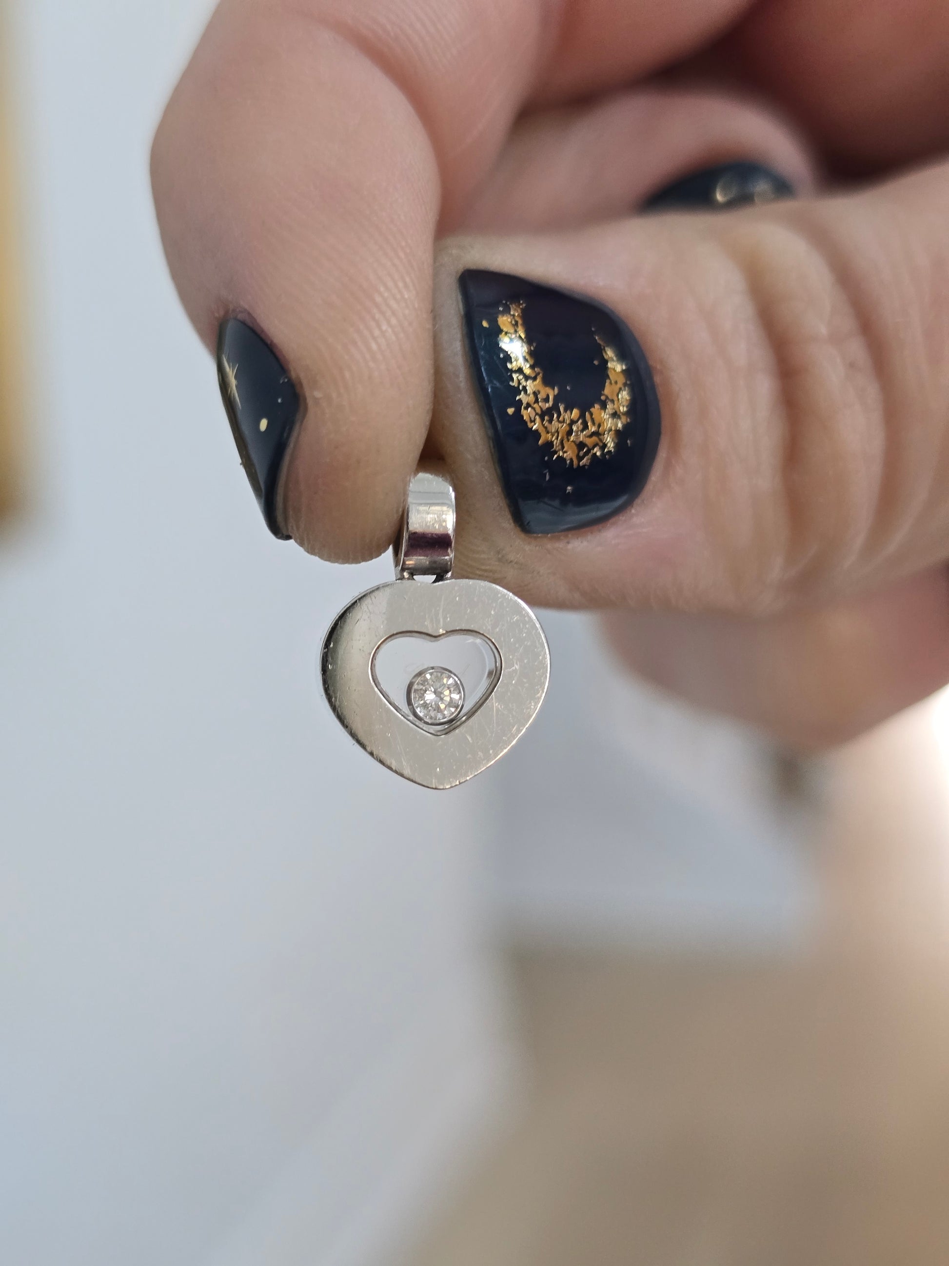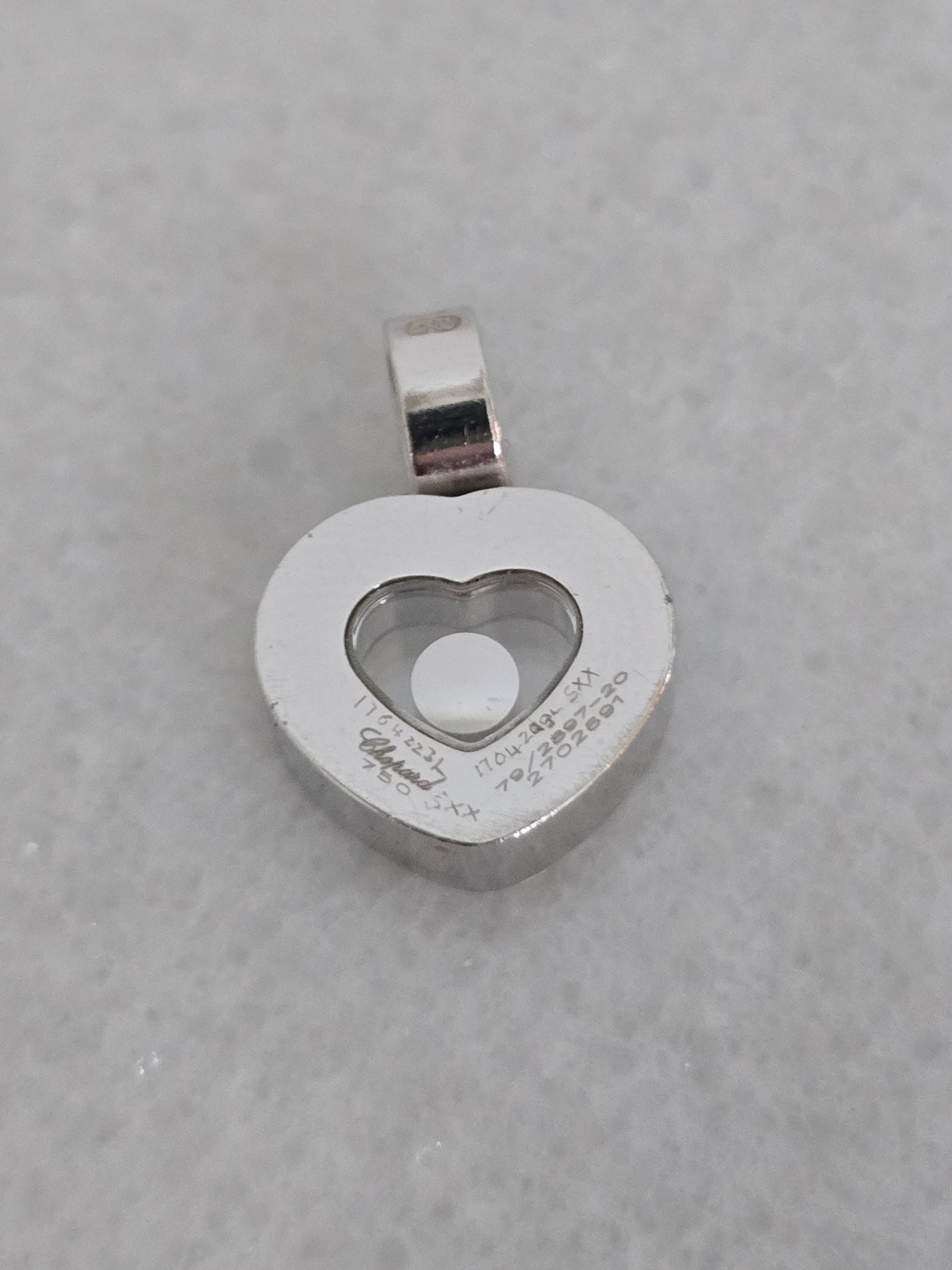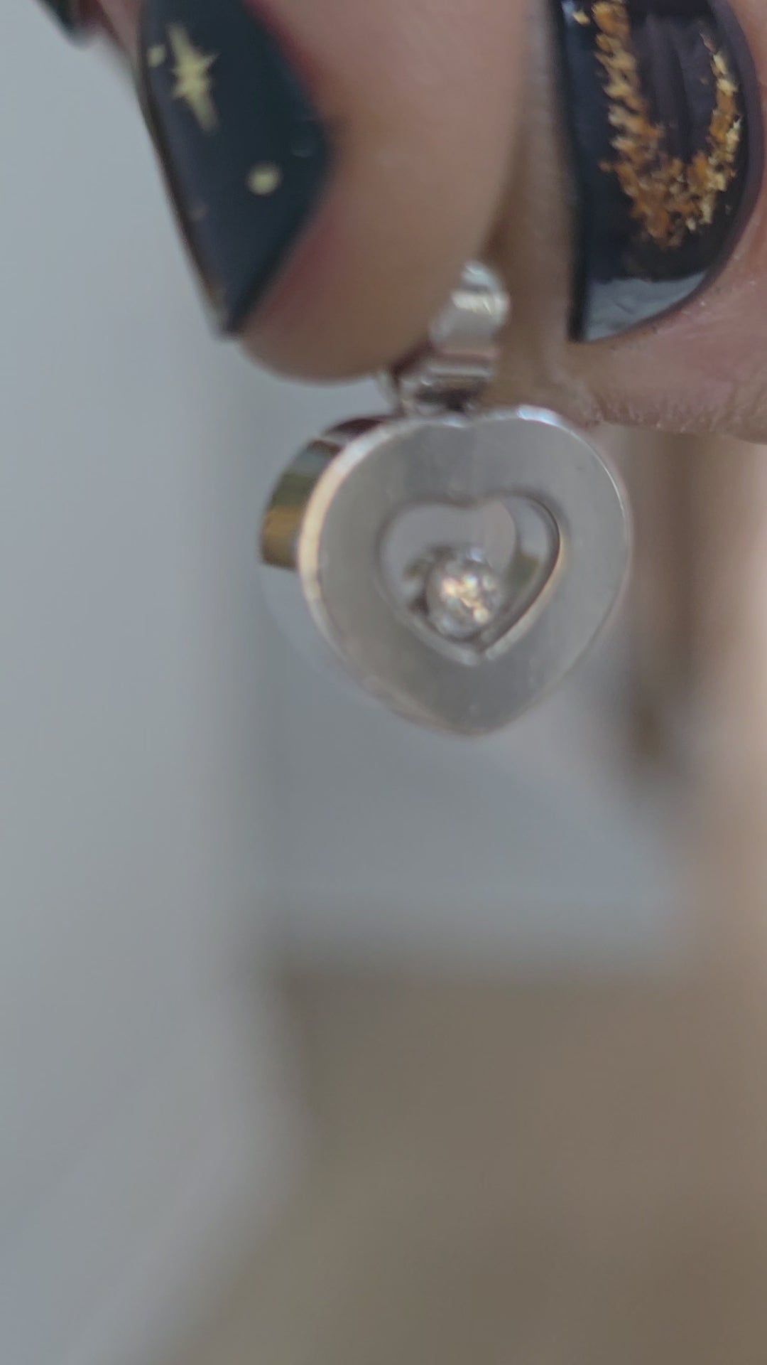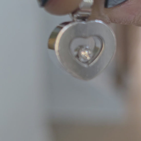 This vintage Chopard Happy Diamonds Icon pendant is 18k white gold, designed as a heart, comprising a locket with a free moving round brilliant cut diamond. It is signed Chopard and numbered, with Swiss assay marks. The total weight is 3.9 grams.